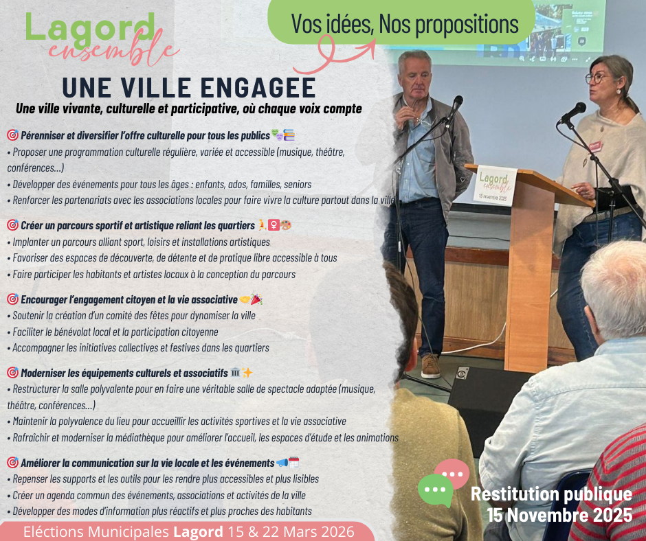 Vos attentes sont fortes : plus d’événements culturels pour tous, une vie associative dynamique, des équipements adaptés, des espaces publics vivants et une communication plus claire pour ne rien manquer de la vie lagordaise. 🌟📣
